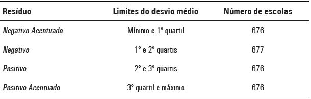 A seguir, a população de escolas é dividida em quatro grupos de mesmo tamanho e dispostos em ordem ascendente de resíduos. Dessa forma, os grupos 1 e 2, chamados respectivamente de “Negativo Acentuado” e “Negativo”, correspondem às escolas que tiraram nota média real abaixo daquela prevista para elas em 2005. “Negativo Acentuado” corresponde, assim, ao primeiro quarto da distribuição. Nos referidos grupos, portanto, as escolas ficaram muito abaixo do que deveriam segundo o modelo de crescimento aqui proposto. Por outro lado, há os grupos 3 e 4, que correspondem respectivamente aos resíduos “Positivo” e “Positivo Acentuado”, indicativos de escolas cujas médias em 2005 ficaram acima dos seus respectivos valores previstos, correspondendo o último grupo à parte superior da distribuição de resíduos.