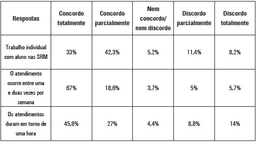 Com isso, aflora a necessidade de discutir outro assunto indispensável no que tange ao funcionamento do serviço de AEE, este consiste na quantidade das SRM dispostas nos municípios brasileiros. Questionou-se, como pode ser visto na Tabela 3, se a quantidade de SRM é suficiente para atender à demanda, e a maioria afirmou não ser suficiente (60,2%).