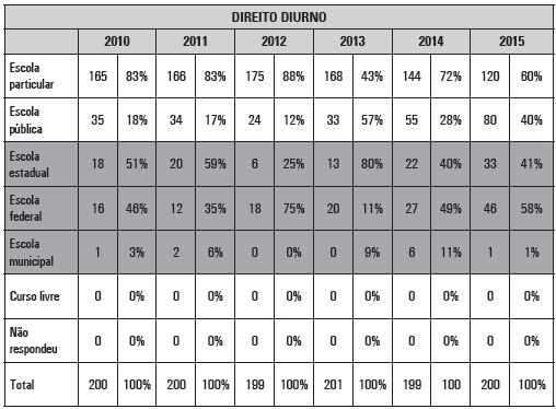 Em 2010, os estudantes provenientes de escolas particulares ocupavam 83% das vagas do curso de Direito diurno; em 2015 esse percentual se reduziu para 60%. Em relação à participação relativa de alunos provenientes de cada rede no interior do setor público, observa-se, assim como ocorreu com Medicina, uma maior participação dos egressos das escolas federais.