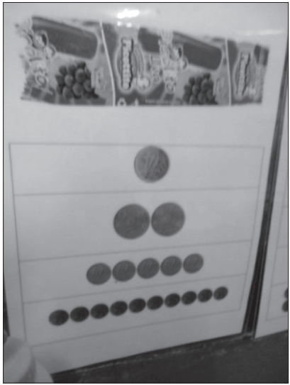 Foi o caso de uma das professoras, que, diante da constante presença de moedas em sala de aula, levadas pelas crianças para comprar picolés na escola, decidiu trabalhar os valores e as quantidades de moedas necessárias para a aquisição dos picolés, que custavam R$ 0,50 e R$ 1,00. A professora explorou com as crianças o valor das moedas de R$ 0,05 até R$ 1,00 utilizando estratégias verbais e visuais e organizou cartazes, conforme as Figuras 1 e 2. Após a elaboração dos cartazes, toda vez que uma criança levava moedas para comprar picolé, a professora ia com ela até os cartazes e realizava exercícios de comparação e quantificação, considerando o que estava no cartaz e as moedas que a criança possuía. Fazia isso até que a criança entendesse se seria possível ou não comprar o picolé. Em alguns casos, a quantidade que a criança possuía não era suficiente para realizar a compra, e as próprias crianças, a partir dos exercícios realizados, se davam conta disso. Em outros casos, as crianças não chegavam a essa conclusão, então, a professora explicava e dizia que consumir picolé não era tão saudável quanto consumir o lanche da escola. A professora sempre oferecia o lanche gratuito da escola para todas as crianças, incentivava o consumo desse lanche e também o consumia. A professora deixou claro que procedia assim com as crianças cujas famílias haviam autorizado a compra de picolé. Como os picolés eram vendidos pela escola, essa foi a maneira que ela encontrou de tratar a situação com suas crianças. No mês de julho de 2015, a professora retirou os cartazes da sala e informou que um dos pais, de outra turma, tinha denunciado a venda de picolés pela escola, dizendo que estava tendo muitos problemas com o filho. Por esse motivo, os picolés não estavam mais à venda.