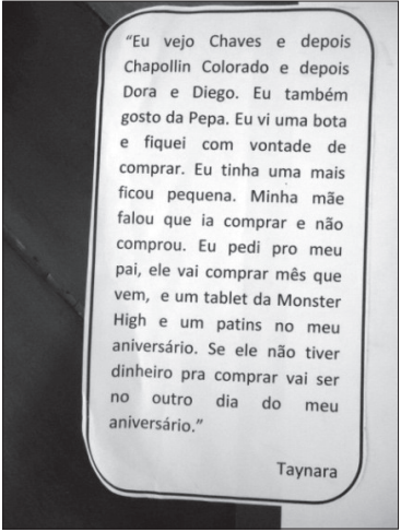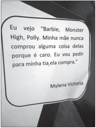 Essas narrativas remetem-nos ao universo dessas crianças, que se mostram significativamente imbricadas na cultura da mídia e do consumo. Elas se mostram conhecedoras de uma variedade de programas televisivos e ícones infantis reconhecidos globalmente, ainda que com impedimentos financeiros para a participação no consumo de bens materiais atrelados a essa cultura: “Minha mãe nunca comprou alguma coisa delas porque é caro. Eu vou pedir para a minha tia, ela compra”.