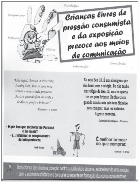 Após a sistematização das narrativas das crianças, a professora decidiu trabalhar de modo mais direto com as questões do consumo, problematizando-o junto com elas. Como não havia materiais sobre o tema na escola, para abordá-lo com as crianças, a professora precisou inventar uma história com imagens que ela capturou na internet. Aliás, a criação no trabalho pedagógico, no âmbito desse projeto, se fez muito presente na própria criação de materiais (pela professora e também pelas crianças) para trabalhar o tema da mídia e do consumo, já que são poucos os materiais disponíveis sobre esses temas que chegam até as escolas. Primeiro, a professora contou a história com uso de datashow; depois, transformou a história em livro; em seguida, após um trabalho de problematização, propôs que cada criança recontasse a história a partir das imagens fornecidas por ela. Depois disso, elaborou uma atividade que os pais deveriam responder e que tinha como objetivo discutir com as crianças as questões do consumo. Nessa atividade, os pais deveriam marcar qual produto comprariam para seus filhos e escrever por quê. Constavam, por exemplo, imagens de mochilas funcionais e com valor financeiro razoável e mochilas com ícones da mídia televisiva, muito mais caras se comparadas com as primeiras. Ainda sobre a busca de parceria com as famílias no trabalho que estava sendo realizado no projeto, a professora propôs outra atividade: as famílias deveriam desligar a televisão durante uma hora e realizar alguma atividade junto com as crianças durante esse tempo em suas casas. No dia seguinte, as crianças contaram na escola o que tinham feito durante o tempo em que a televisão havia ficado desligada.