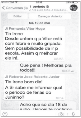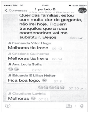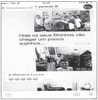 Essa instantaneidade também acontecia no momento da própria aula, quando a professora, em muitas circunstâncias, enviava fotografias do que estava acontecendo com as crianças, ou mesmo quando estava em casa e precisava se comunicar com as famílias: