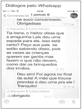 Sobre a vida escolar, houve, efetivamente, o envolvimento das famílias nos projetos desenvolvidos por essa professora durante o ano de 2015. Entre esses projetos, esteve o intitulado Alimentação Saudável, que tinha relação com o Projeto Político-Pedagógico da escola e estava atrelado também às inquietações da professora diante dos lanches industrializados que as crianças levavam para a escola. Nesse projeto, a cada semana, a professora escolhia um alimento que as crianças tinham dificuldade em comer (cebola, cenoura, beterraba), explorava-o em sala de aula, levando-o para as crianças (textura, gosto, cheiro, funções/vitaminas no organismo, etc.); depois, pedia que uma das famílias preparasse, junto com a criança, uma receita com esse alimento e enviasse para a escola para que todo o grupo degustasse. As experiências relacionadas a esse projeto, como negociar qual seria a família que ficaria responsável pela receita naquela semana, eram realizadas pelo WhatsApp. Os processos vividos relacionados a este e a outros projetos também eram compartilhados no universo virtual pela professora, pelas famílias e pelas próprias crianças, que gravavam mensagem de voz contando o que estava acontecendo ou mesmo emitindo opiniões sobre os projetos realizados.
