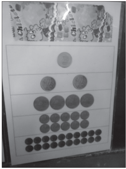 Foi o caso de uma das professoras, que, diante da constante presença de moedas em sala de aula, levadas pelas crianças para comprar picolés na escola, decidiu trabalhar os valores e as quantidades de moedas necessárias para a aquisição dos picolés, que custavam R$ 0,50 e R$ 1,00. A professora explorou com as crianças o valor das moedas de R$ 0,05 até R$ 1,00 utilizando estratégias verbais e visuais e organizou cartazes, conforme as Figuras 1 e 2. Após a elaboração dos cartazes, toda vez que uma criança levava moedas para comprar picolé, a professora ia com ela até os cartazes e realizava exercícios de comparação e quantificação, considerando o que estava no cartaz e as moedas que a criança possuía. Fazia isso até que a criança entendesse se seria possível ou não comprar o picolé. Em alguns casos, a quantidade que a criança possuía não era suficiente para realizar a compra, e as próprias crianças, a partir dos exercícios realizados, se davam conta disso. Em outros casos, as crianças não chegavam a essa conclusão, então, a professora explicava e dizia que consumir picolé não era tão saudável quanto consumir o lanche da escola. A professora sempre oferecia o lanche gratuito da escola para todas as crianças, incentivava o consumo desse lanche e também o consumia. A professora deixou claro que procedia assim com as crianças cujas famílias haviam autorizado a compra de picolé. Como os picolés eram vendidos pela escola, essa foi a maneira que ela encontrou de tratar a situação com suas crianças. No mês de julho de 2015, a professora retirou os cartazes da sala e informou que um dos pais, de outra turma, tinha denunciado a venda de picolés pela escola, dizendo que estava tendo muitos problemas com o filho. Por esse motivo, os picolés não estavam mais à venda.