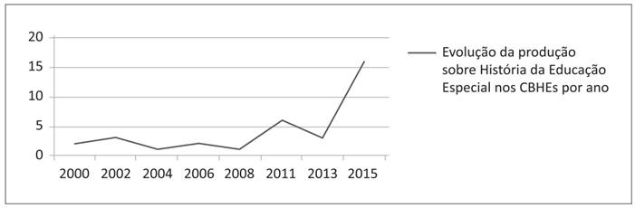 Com base nos dados compilados, podemos constatar que, embora pareça existir uma tendência de crescimento, a distribuição dos trabalhos relacionados à História da Educação Especial nos CBHEs ocorre de forma irregular no período considerado (2000-2015). Nas cinco primeiras edições, isto é, de 2000 a 2008, o número de comunicações propostas é praticamente constante e ínfimo, oscilando entre um e três trabalhos. Já os anos de 2011 e 2015 apresentam as maiores concentrações, respectivamente com seis e 16 títulos, intermediados, porém, pelo ano de 2013, com apenas três produções, o que, de certo modo, quebra a expectativa de aumento iniciada em 2011. Ainda sobre 2015, vale esclarecer que, pela primeira vez, houve a proposição e aceite de uma comunicação coordenada sobre História e Memória das instituições brasileiras de Educação Especial3, a qual contou com quatro trabalhos, mínimo necessário para comunicação dessa natureza, segundo as regras do evento; dois desses figuram duplicados como comunicações individuais, razão que nos levou a não computá-los duplamente. Um gráfico de linhas torna mais perceptível a evolução quantitativa das produções sobre História da Educação Especial nos CBHEs. Vejamos: