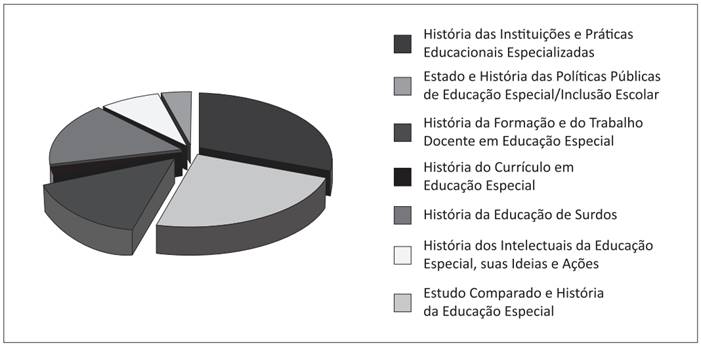 No tocante aos temas abordados pelos textos compilados a partir dos referidos anais, buscamos organizá-los em algumas categorias temáticas adaptadas por nós, que não se enquadram, necessariamente, na proposta de eixos temáticos definidos pelos CBHEs, porquanto esses surgem de motivações distintas, relacionados à composição dos eventos e aos interesses investigativos privilegiados pela e na área de História da Educação lato sensu, no transcorrer do período delimitado. Ressaltamos também o risco e as ambivalências de qualquer categorização a posteriori, feita à revelia dos autores dos próprios textos, embora pensemos que, em contrapartida, essa prática possa mediar a emergência de novas abordagens e escolhas investigativas em relação à pesquisa histórico-educacional, especialmente no caso da historiografia da Educação Especial, fornecendo uma espécie de mapa do caminho já percorrido. Esse mapa, por sua vez, pode vir a ser uma referência ou instrumento útil para que outras rotas sejam traçadas, em busca de se explorar lugares pouco visitados e, assim, superar lacunas existentes nesse campo.