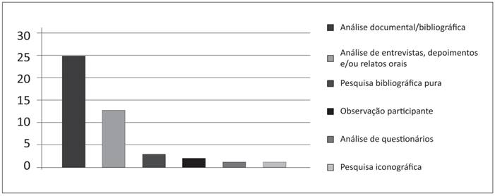Por fim, resta-nos empreender algumas reflexões sobre os procedimentos metodológicos de coleta e análise de dados utilizados pelos estudos que compilamos. Mais uma vez, empreender categorias, aqui, é uma tarefa delicada, pois nem todos os autores classificam ou explicitam seus procedimentos ou, ainda, como esperado, recorrem a mais de um deles, em busca de vários dados e fontes para fundamentar suas pesquisas. Em que pesem, porém, os riscos, podemos observar que os estudos recorrem, basicamente, a estas metodologias, pela ordem decrescente de ocorrência e procedimentos priorizados na coleta de dados, existindo trabalhos agrupados em mais de uma categoria metodológica, a saber: análise documental, combinada ou não com a pesquisa bibliográfica; análise de entrevistas semiestruturadas, depoimentos e/ou relatos orais, com ou sem caráter autobiográfico; pesquisa bibliográfica pura; observação participante; análise de questionários e pesquisa iconográfica. Um gráfico de colunas ajuda a ilustrar a incidência das categorias metodológicas ora elencadas: