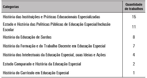 Feitas as ponderações citadas, pudemos classificar os trabalhos sobre História da Educação Especial aceitos nos CBHEs em categorias temáticas, distribuídos quantitativamente conforme a tabela a seguir. Nessa distribuição quantitativa, cumpre advertir, ainda, que, em alguns casos, um mesmo trabalho recebeu mais de uma classificação, em virtude do(s) enfoque(s) predominante(s). Vejamos: