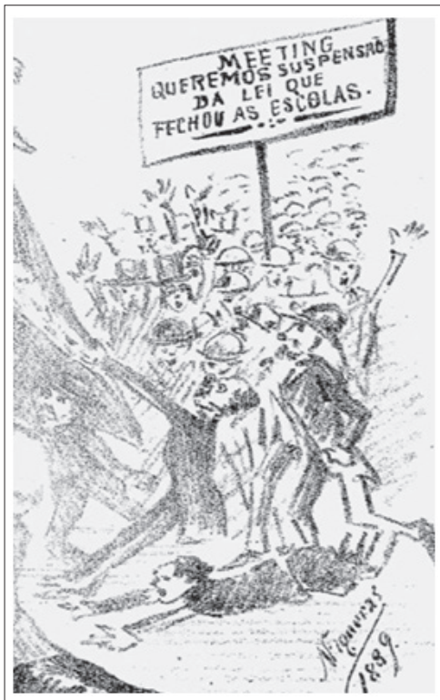 A imagem que abre este artigo guarda relações próximas com eventos ocorridos no ano de 2015, quando o governo de Geraldo Alckmin, no Estado de São Paulo, a pretexto de reorganizar o ensino, decidiu pelo fechamento de 94 prédios escolares, afetando com isso 311 mil alunos e 74 mil professores. O anúncio gerou protestos de professores e alunos, que ocuparam 193 escolas, resultando na suspensão da medida1. Porém, no caso aqui reproduzido, trata-se da ampliação de um detalhe de uma charge2 de página inteira publicada em janeiro de 1889 na Província do Paraná, na revista Galeria Illustrada3. Nela, podemos ver representados um agrupamento de pessoas mobilizadas em protesto e um cartaz que pede que a lei que fechou as escolas seja suspensa.