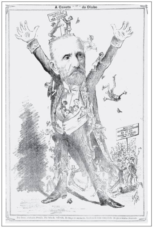 A alusão da charge anteriormente mencionada ao possível desligamento de Balbino de seu cargo em decorrência da crise provocada pelo sancionamento da lei não se confirmou de imediato, embora o jornal Diário de Notícias do Rio de Janeiro tenha publicado três notas sobre essa questão, nos dias 7, 11 e 14 de setembro de 1888. Nelas, ao contrário do que a legenda da imagem indicava, o pedido não teria partido dele, mas requerido em sessão do Senado por Silveira Martins (1835-1901)29, e negado pelo presidente do Conselho, que declarou não haver motivos para tal medida. Embora Balbino tenha permanecido em seu cargo, o mesmo não ocorreu com outros membros da administração em vigor, pois, em janeiro de 1889, o jornal Sete de Março publicou o telegrama em que o tenente-coronel Antonio Luiz Bittencourt, em desacordo com a administração da Província e por ter recebido ordens para executar a lei, solicitou demissão do seu cargo de inspetor paroquial “a fim de não pactuar com o criminoso procedimento da Assembleia liberal” (PARANAGUÁ. Sete de Março, 9 jan. 1889, p. 4). Não obstante, fatores como o agravamento da situação decorrente das polêmicas políticas e a mudança de gabinete no Império, de conservador para liberal, em 18 de junho de 1889 (ALVES, 2014, p. 296), fizeram com que Balbino finalmente se retirasse, entregando o governo, em 29 de maio de 1889, a Jesuíno Marcondes de Oliveira, líder do Partido Liberal e opositor direto de seu governo (CARNEIRO, 1994, p. 405).