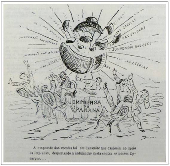 A notícia da supressão das escolas gerou intensos protestos nas principais cidades do Paraná, tendo a imprensa, por meio das redações dos jornais e revistas, tomado para si o papel de principal porta-voz da indignação popular. O assunto conquistou espaço considerável na Galeria Illustrada, revista em que a charge mencionada foi publicada e que se apresentara ao público em sua primeira edição como um veículo neutro. As notícias sobre o tema tiveram lugar também em jornais que circulavam na Província do Paraná, entre eles o Dezenove de Dezembro, órgão do Partido Liberal que, sob a responsabilidade de Jesuino da Silva Lopes, tinha como uma de suas tarefas a divulgação dos atos relativos à Assembleia Provincial, à época também de maioria liberal, como vimos anteriormente. Os debates e críticas propriamente ditos se fizeram presentes nestes jornais: a Gazeta Paranaense, identificada como órgão do partido conservador e sob a direção de Benedito Carrão; Sete de Março, órgão do Partido Conservador, fundado para apoiar a gestão que estava no poder, sob a responsabilidade de Justiniano de Mello; A República, órgão do clube republicano, dirigido por Joaquim Antonio da Silva; e A Idea, jornal ligado ao Clube dos Estudantes24, impresso na tipografia do jornal A República com a colaboração de seus membros. Fazendo coro com esses jornais locais, foram encontradas referências ao assunto na Gazeta de Notícias e no O Paiz do Rio de Janeiro. Esse debate, analisado na sequência, movimentou a cena pública durante certo tempo, chamando a sociedade à ação em defesa da instrução pública.