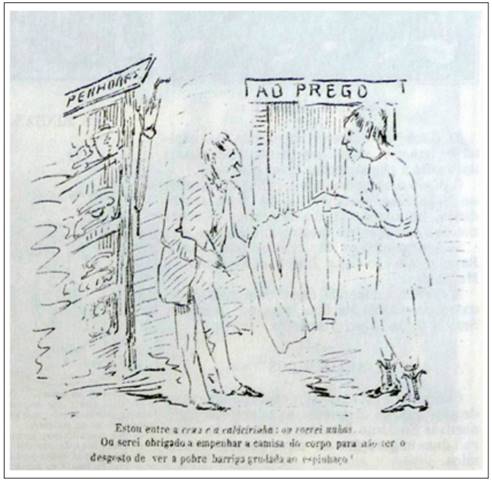 A incerteza da situação dos professores que ficariam sem suas aulas e consequentemente sem os rendimentos delas provenientes foi objeto de atenção de Narciso Figueras28, redator-proprietário da Galeria Illustrada e que nela atuava como litógrafo e ilustrador. As charges que publicou sobre o assunto ressaltam a penúria a que os mestres seriam submetidos, caso a lei fosse aprovada, sendo obrigados a penhorar suas roupas e a roer suas unhas para sobreviver (IMAGEM 4). Representados sempre muito magros e maltrapilhos, os profissionais da educação seriam a imagem viva do descaso com que a educação estaria sendo tratada no Paraná.