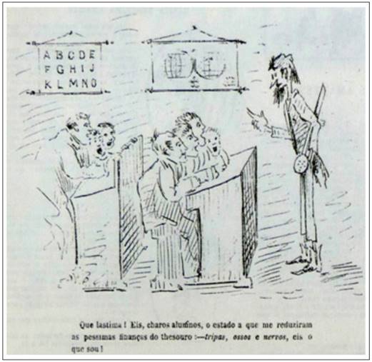 Na imagem a seguir (IMAGEM 5), a figura esquálida do professor explica a situação aos alunos sobre seu estado físico, reduzido a “tripas, ossos e nervos”, causado por dificuldades financeiras (FIGUERAS. Galeria Illustrada, 10 dez. 1888c, p. 23).