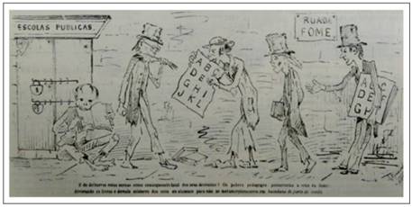Em outra charge (IMAGEM 6), os professores, chamados de “pobres pedagogos”, percorrem a “rua da fome” e mendigam diante das escolas fechadas. Não tendo o que comer, alimentam-se dos abecedários e livros didáticos que haviam pertencido aos seus alunos, correndo o risco de se transformarem em “bacalhaus de porta de venda” (FIGUERAS. Galeria Illustrada, 10 dez. 1888, p. 23).