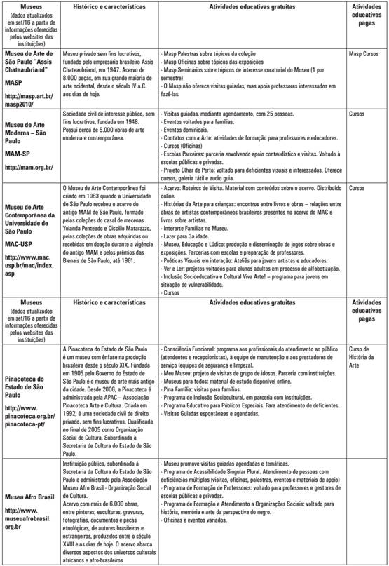 Por fim, ainda entre as estratégias de ordem objetiva que distanciam os museus de um público de massa, destaca-se aqui a forma de gestão dos museus de arte. Até hoje, a grande maioria deles é apoiada administrativamente e mantida por grandes empresas. Por exemplo, o MAM-SP tem como seus mantenedores bancos como Bradesco, Itaú, Votorantin e as empresas Gerdau, Samsung e Telefônica Vivo. Nessa linha de raciocínio, o conselho deliberativo do MASP - composto por 83 membros, grande parte deles empresários do comércio (Riachuelo) e investimentos financeiros - tem entre seus diretores estatutários figuras ligadas a altos postos do Itaú BBA, Embraer, Credit Suisse, entre outras empresas brasileiras e estrangeiras. A condução de seus propósitos, pedagógicos ou não, ainda que tenha parceria com órgãos públicos e ou educativos, não possui uma sistemática contínua. Como se pode verificar no quadro abaixo11, os museus analisados sinalizam atividades educativas grátis, visitas guiadas, ateliês, cursos de arte, entre outros, na tentativa de aproximar um público mais cativo. Contudo, devido à sua pequena visibilidade e efetividade, acabam acessando uma reduzida audiência.