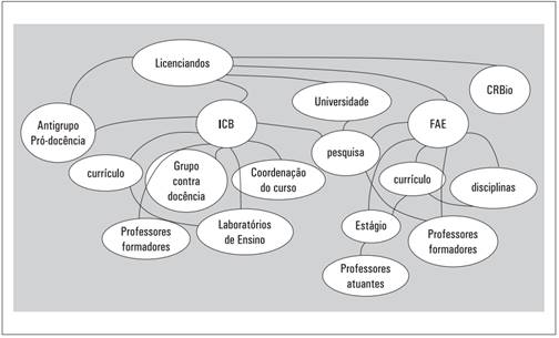Este trecho do grupo focal nos parece de especial relevância, pois, surpreendentemente, evidencia a Faculdade de Educação como um ator-rede contra identidade. Quando afirmam que os professores desconhecem o contexto da escola básica, sobre o qual ensinam, e que, assim como no ICB, também na FaE a pesquisa é mais valorizada que o ensino, os licenciandos percebem contradições entre sua formação e o papel que se espera de uma faculdade de educação - valorizar o ensino. Assim, destacamos no ator-rede FAE, os actantes Professores formadores, que surpreendentemente agem desvalorizando o ensino em detrimento da pesquisa, e com isso desviando o interesse dos licenciandos pela docência.