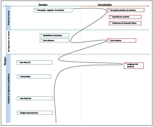 Para sintetizar os desvios e associações realizadas pelos actantes rastreados nas falas dos licenciandos, apresentamos o diagrama de translações da rede identitária ao longo do tempo:
