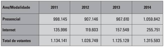 Considerando a população total do Estado, estimada em 11, 2 milhões de pessoas6, os números revelam um volume significativo de participantes, equivalendo, na média anual, a cerca de dez por cento. Os anos 2013 e 2014 demonstram uma tendência ascendente da participação, tanto presencial como pela internet, embora nesta estejam incluídos os números da consulta sobre a reforma política, inexistente nos primeiros dois anos (2011 e 2012).