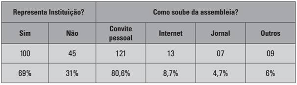 Percebe-se que quase dois terços, 69% dos participantes, representam ou estão vinculados a alguma instituição ou setor da administração pública. Isso significa que as demandas evidenciadas nas assembleias são em grande parte vinculadas a interesses de corporações organizadas previamente. Por exemplo, foi evidente em alguns lugares a participação em número expressivo de integrantes da polícia militar que traziam, entre suas demandas, recursos para aquisição desde coletes a viaturas.