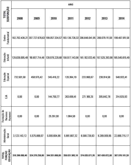 Assim, as informações sobre as despesas por subfunção no município de Vitória possibilitaram conhecer quais eram as etapas e/ou modalidades enfatizadas na política da rede municipal de ensino de Vitória, no período de 2008 a 2014, ou seja, o ensino fundamental e a educação infantil, representadas nos valores destinados a essas etapas no total de recursos vinculados à função educação. Considera-se ainda, a definição da LDB/1996 quanto às competências de cada ente federado pela oferta educacional, na qual cabe ao município o atendimento prioritário na educação infantil e no ensino fundamental.