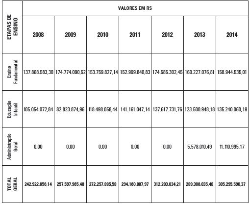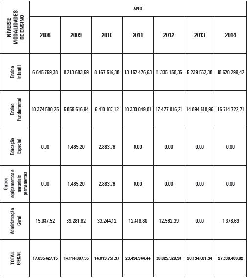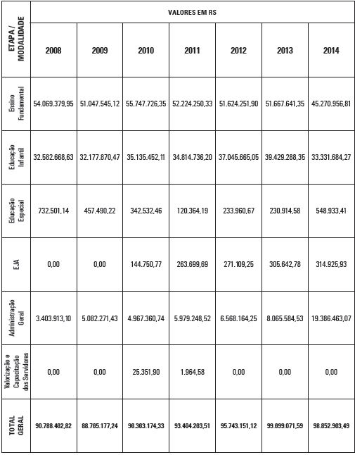 Notamos que foi despendido com custeio um total de aproximadamente R$ 91 milhões em 2008e R$ 99 milhões em 2014 (SEMFA, 2008e 2014), destinados às diferentes etapas e modalidades de ensino, apresentando oscilações nos valores, mas resultando em um aumento percentual relativo de 9% entre 2008 e 2014.
