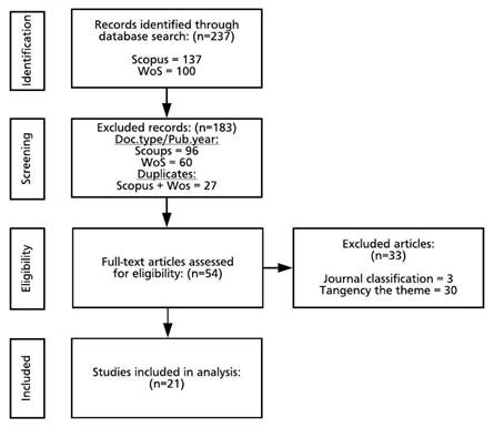 In the initial search with the terms presented in Table 1, 100 records were found in WoS and 137 in Scopus. Then, after applying the inclusion criteria (document type and year of publication), 40 records were selected from WoS and 41 from Scopus. The articles were grouped by database and imported into the Mendeley software, where 27 duplicates were again grouped and removed, totaling 54 articles. As a criterion of quality and additional selection, the journals in which the articles were published were checked, and the articles were classified according to the indicators presented in Table 2 (JCR, 2019; Qualis, 2019; SJR, 2019), in their most recent versions available in June 2019.