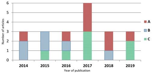 The publications occurred in all the years researched. Figure 2 shows the number of selected articles for this study, distributed by the year of publication and the journal classification, presented in Table 2.