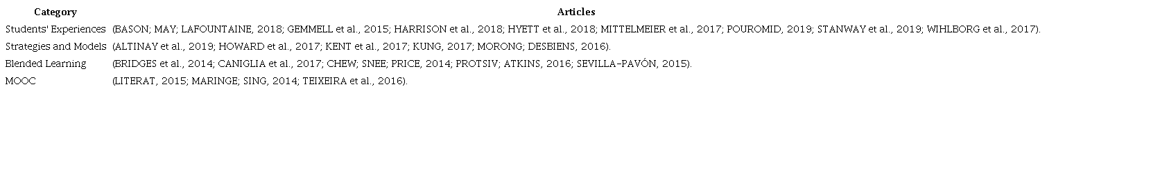 The articles were tabulated in a synthesis matrix to identify the similarities and were categorized based on similarities found in terms of objectives and types of learning approach employed. Considering the students' experiences using digital learning platforms, the strategies, guidelines or models presented, and the types of learning approaches, four categories were constructed - (i) Student Experiences; (ii) Strategies and Models; (iii) Blended Learning; and (iv) MOOC - as presented in Table 3.