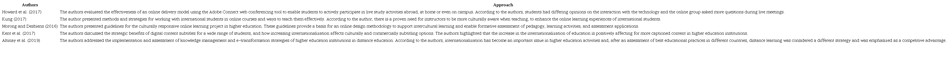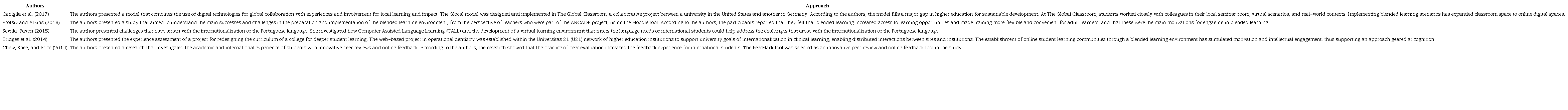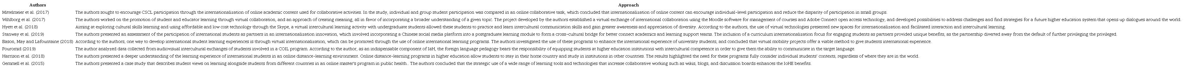 Finally, the articles were tabulated in a synthesis matrix (GARRARD, 2016; KLOPPER; LUBBE; RUGBEER, 2007), using a spreadsheet to identify similarities and categorize the articles based on similarities found in terms of objectives and types of learning approach employed. Some articles aimed to present the experiences of students, others focused on presenting models, strategies, and guidelines to support internationalization, and all were supported by some kind of digital learning platform. Online or virtual learning platforms, blended learning, and MOOCs are examples of the types of learning approaches found in the selected articles.