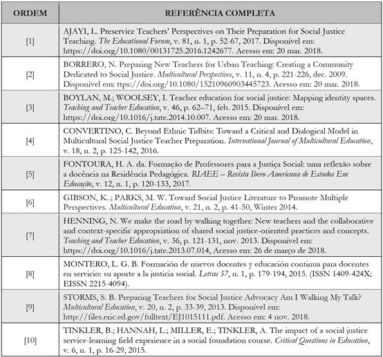 ABSTRACT: This study presents the results of an analysis of articles published in magazines in the area of Education that report experiences of training teachers for social justice. The objective is to understand how the documented training for social justice can be carried out, based on the identification of the theoretical assumptions that support it, the analyzes used and the results achieved by them. One methodology used was the systematic review of 10 articles based on empirical studies, published between 2009 and 2017, available for free access in specialized journals. After selecting the articles, they were submitted to a content analysis, what enabled the understanding of practices and principles of teacher education for social justice. The results show how teacher training for social justice are based on pedagogies of resistance, social and transformative character, in addition to implying a reflection on different levels, on multicultural education and on the specificities of educational contexts, requiring trainees great critical sense.