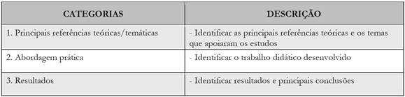 Para a análise dos dados, passamos por duas etapas, realizadas com a técnica de análise de conteúdo e com apoio de duas grelhas de análise (Grelhas 1 e 2) e do programa Excel. A primeira etapa foi baseada na observação dos aspectos técnicos e metodológicos dos estudos, e a segunda etapa fundamentou-se na observação de conteúdos, referências, abordagem didática e conclusões dos estudos. A elaboração das grelhas de análise ocorreu junto a equipes de trabalho, com diferentes pesquisadores da área da Educação3, e contou, portanto, com discussões junto a especialistas, os quais acompanharam todo o processo e validaram o instrumento.