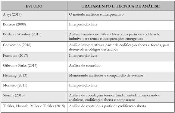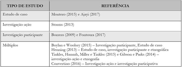 Observamos que os estudos dão importância em identificar o paradigma, a natureza e os tipos de estudos que apoiaram suas investigações. No paradigma sociocrítico, autoincluem-se os estudos de Storms (2013) e Convertino (2016); no paradigma interpretativo, estão os estudos de Borrero (2009), Henning (2013), Gibson e Parks (2014), Tinkler, Hannah, Miller e Tinkler (2015), Boylan e Woolsey (2015), Fontoura (2017), Ajayi (2017) e Montero (2015). Quanto à natureza, todos os estudos enquadram-se como qualitativos. E os tipos de estudos mais empregados foram o Estudo de caso, a Investigação participante e a Investigação-ação.