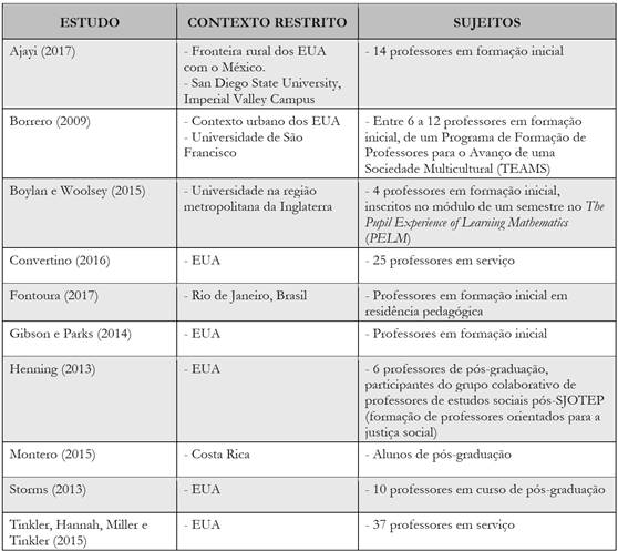 Como podemos observar, a maioria dos estudos foram realizados nos EUA. Nesse contexto específico, os estudos apresentam maior apelo para a temática da diversidade e da questão racial. Um dos estudos relata a existência de tensão na formação de professores, por conta de o maior número de alunos/professores em formação ser branco, ou se identificar como tal, e pelo fato de o curso ter sido realizado por uma professora formadora que se identificava negra, a qual refletia sobre o seu papel dentro de contextos marcados por uma diversidade cultural e racial.