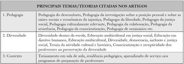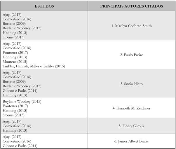 Marilyn Cochran-Smith, Paulo Freire e Sonia Nieto são os autores mais citados nos trabalhos analisados. Marilyn Cochran-Smith, pesquisadora norte-americana, traz para os estudos uma discussão sobre as comunidades de pesquisa e a prática e a política de formação de professores comprometidas com a justiça social. Paulo Freire, educador brasileiro, bastante conhecido a partir de suas obras sobre a pedagogia pautada na libertação, traz a ideia de resistência e de transformação social. Sonia Nieto, também pesquisadora norte-americana, traz os temas da diversidade, do multiculturalismo, da diversidade linguística, da equidade e da justiça social na educação.