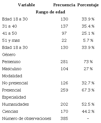 Para el abordaje cuantitativo del estudio se siguió un muestreo no probabilístico accidental. Hubo un primer criterio de selección, a saber: la tenencia de un ordenador portátil entregado gratuitamente a cada estudiante en el marco del Plan CEIBAL. Los datos facilitados por las autoridades educativas nos permitió identificar una población inicial de 2250 estudiantes de profesorado, los cuales reunían este criterio. La muestra finalmente quedó constituida por aquellos estudiantes que accedieron a responder al instrumento cuantitativo. Esto es, un total de 385 estudiantes de profesorado. Como se observa en la Tabla 1, de ellos, el 73% son mujeres y el 27% hombres. El promedio de edad es de 35 años. El 47% estudia carreras de ciencias experimentales, de ciencias de la naturaleza o exactas. Con relación a la modalidad de estudio, el 67.3% está inscrito en la modalidad presencial mientras el resto en un modelo hibrido de formación, con un alto componente de educación virtual.