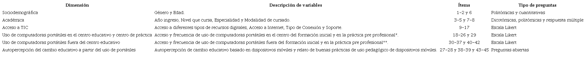La adaptación de la encuesta “Survey of Mobile device use during” (Witecki y Nonnencke, 2015) resultó en un instrumento constituido por 45 reactivos, como se observa en la Tabla 2. Éste incluyó un primer grupo de preguntas de carácter demográficas que permitían abordar el perfil del estudiantado y el nivel de acceso de estos a las tecnologías. Seguidamente mediante escala Likert se cuestionaba acerca del uso del laptop que hacen en su formación docente, pero en tres tipos de escenarios: centro educativo y de práctica pre profesional y en el hogar. Por último, un total de siete preguntas abiertas pretendían indagar sobre la autopercepción de los futuros docentes sobre sus experiencias de uso pedagógico del laptop.
