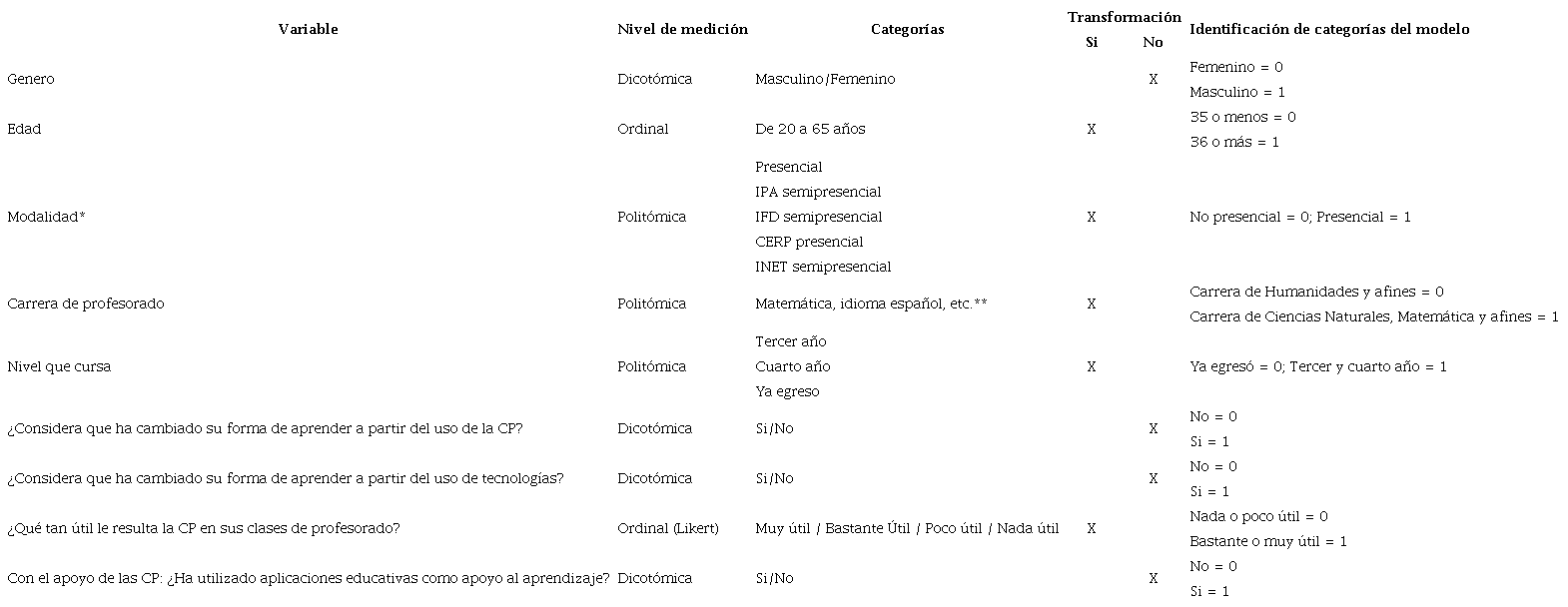 El proceso de análisis de los datos fue estructurado en base a los propósitos del estudio. El análisis de los datos recabados con la encuesta se realizó utilizando el software SPSS. En primer lugar, se recurrió a la estadística descriptiva (Media, Desviación Típica, Máximo, Mínimo, Varianza). Posteriormente, se utilizó un modelo de regresión logística (Modelo Logit) o también denominado modelo de respuesta cualitativa (Liu, Wilson y Paek, 2008; Peng y So, 2002). El objetivo de este procedimiento fue identificar las variables determinantes del uso de los ordenadores portátiles. Con la finalidad de adecuar el nivel de medición de las variables a las exigencias del Modelo Logit se adoptaron ciertas decisiones metodológicas. La Tabla 5 resume este proceso, indicando las decisiones asumidas, las categorías de las variables originales y las transformaciones realizadas.