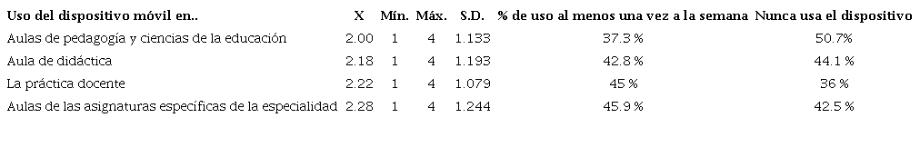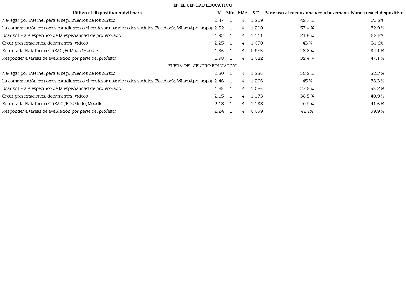 El cuestionario midió la frecuencia de uso del ordenador portátil en cuatro tipos de uso del dispositivo móvil en el propio centro de formación del profesorado y otros siete tipos de uso tanto dentro como fuera del centro educativo. Nunca usaron el dispositivo proporcionado por la administración educativa el 36% de los estudiantes en la práctica docente y el 50.7% en los cursos de las asignaturas pedagógicas. La actividad realizada con mayor frecuencia, tanto dentro como fuera del centro educativo, es la navegación para el seguimiento de los cursos y la comunicación con los estudiantes o con el profesor a través de redes sociales (entre el 45% y el 58% utiliza el dispositivo para estos fines al menos una vez a la semana). No se hallaron diferencias significativas con respecto al uso de los dispositivos según las características consideradas en el modelo de regresión.