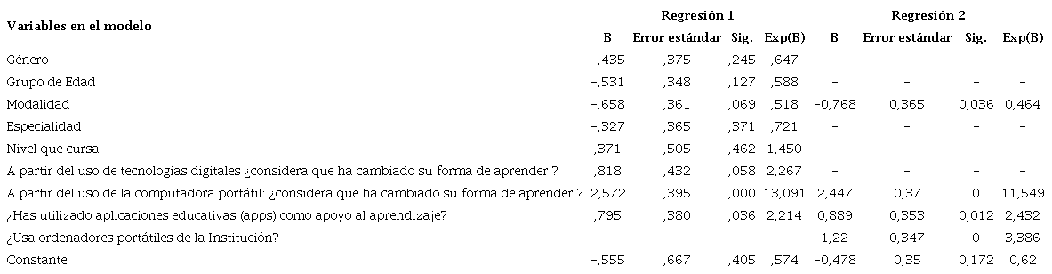 El primer modelo estimado, contiene 8 variables, de las cuales sólo 2 resultaron ser significativas. En la segunda estimación, se eliminan las variables menos significativas hasta obtener una especificación de un modelo con aquellas variables que resultan ser más significativas en conjunto. Así, se conoce que los estudiantes de carreras de pedagogía en modalidad presencial tienen una percepción negativa de la utilidad del ordenador portátil con respecto a los estudiantes en semipresencial. Sin embargo, los estudiantes en general perciben que el uso de ordenador portátil les ha cambiado positivamente su forma de aprender. Además, los estudiantes que cuentan con ordenador portátil tienen mayor probabilidad de usar aplicaciones educativas como apoyo para el aprendizaje.