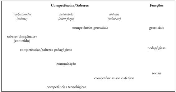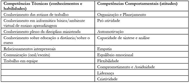 Para Perrenoud (2000), as competências designariam a capacidade de mobilizar, integrar e orquestrar recursos como conhecimentos, habilidades e atitudes para lidar com situações. Aretio (2002), por exemplo, diferencia quatro competências socioafetivas necessárias aos tutores: cordialidade, capacidade de aceitação, honradez e empatia. Palloff e Pratt (2002, 2004), por sua vez, distinguem as competências técnicas (domínio de ferramentas e tecnologias) das competências gerenciais (elaborar regras e tomar decisões a respeito do ritmo dos cursos). De outro lado, Moore e Kearsley (2007) diferenciam quatro funções desempenhadas pelos tutores: ensino, acompanhamento do progresso do aluno, apoio ao aluno e contribuições para o aperfeiçoamento geral do sistema.