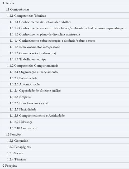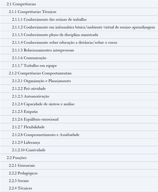 BORGES, J. P. F.; COELHO JUNIOR, F. A.; FAIAD, C.; ROCHA, N. F. da. Diagnóstico de competências individuais de tutores que atuam na modalidade a distância. Educação e Pesquisa, v. 40, n. 4, p. 935-951, 2014.