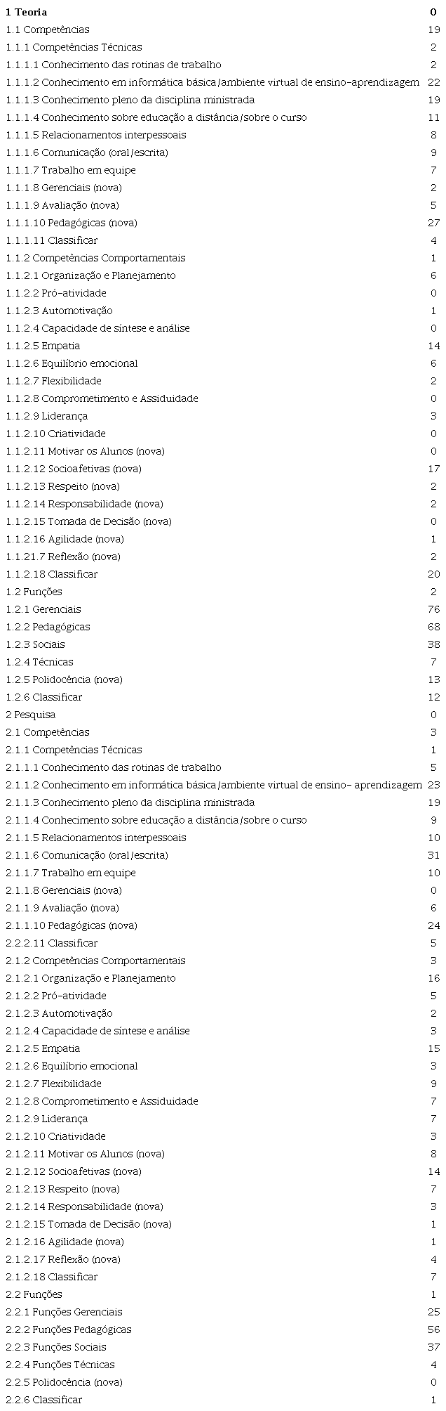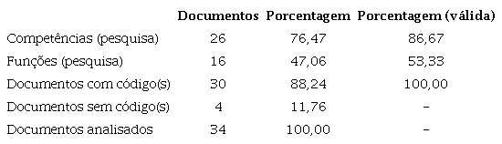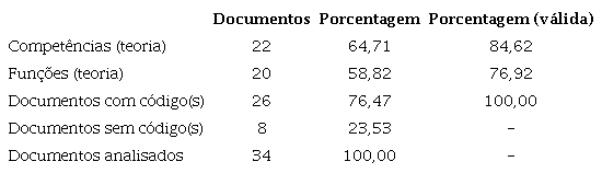 Como já mencionado, tanto nas competências quanto nas funções dos tutores, na teoria e na pesquisa, foi necessário criar novos códigos, identificados na Tabela 3 entre parênteses: (nova). Além disso, em todos os níveis foi criada uma categoria denominada Classificar, quando não foi possível vincular algumas passagens aos códigos existentes, e nem se justificava criar um novo código. Uma leitura posterior das palavras ou passagens associadas a essa categoria Classificar gerou algumas reclassificações em outros códigos, quando isso se demonstrou significativo para a análise, que já contabilizadas no resultado apresentado.