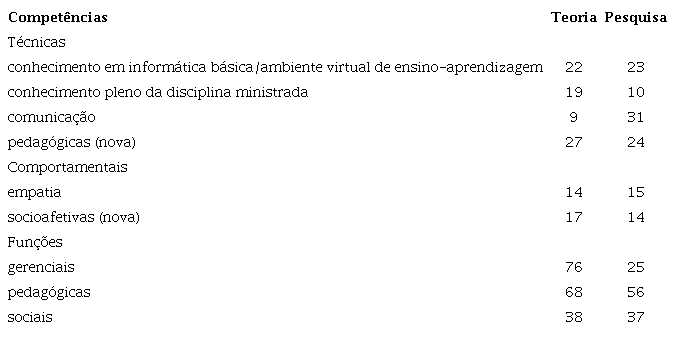 De um total de 795 códigos aplicados a passagens dos 34 textos, 57% (455) estão classificados em competências e 43% (340) em funções. Se considerarmos apenas os resultados das pesquisas empíricas, a diferença é ainda maior (68% para competências e 32% para funções). Nesse sentido, pode-se afirmar que, na literatura em língua portuguesa, há uma preferência por pesquisas sobre as competências dos tutores, em comparação com pesquisas sobre suas funções.