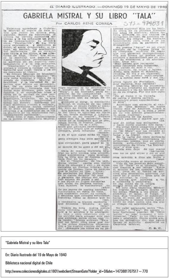 CORREA, C. R. Gabriela Mistral y su libro Tala. In: Diario Ilustrado, Santiago, 19 de Mayo de 1940.