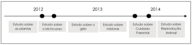 Vinícius, ao tomar a palavra, respondeu o questionamento da professora dizendo que eles tiveram uma pista, quando tentaram identificar o sexo do outro animal. Essa referência é significativa, uma vez que, o aluno fala de uma pista para indicar um dado que sustentou a construção de uma resposta em outro momento da história, o que indica uma continuidade no uso dessa palavra. Porém, uma mudança é que, dessa vez, foi um aluno que falou em uma pista, ao discordar da proposta do colega Ricardo. Na sequência, outras crianças interagiram e se engajaram em uma narrativa para rememorar as pistas que, juntos, usaram para identificar o sexo do bicho-pau, por exemplo, o tamanho dos animais. Essa narrativa evocou um momento vivenciado em grupo no passado, o que é chamado por Bloome et al. (2009) de memória coletiva e nos levou a um retorno na história da turma, especificamente, no segundo semestre de 2012 (ver Figura 1), quando as crianças estudavam a biologia do bicho-pau.