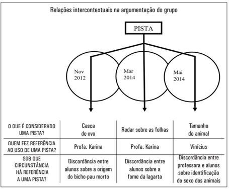 Essas relações intercontextuais orientam o pesquisador em como se mover temporalmente entre eventos que os próprios participantes estão reconhecendo como significativos para o grupo. A partir de contrastes entre esses momentos, podemos reconhecer continuidades ou mudanças na prática argumentativa ao longo do tempo e compreender o uso que a turma fez da palavra pista, enquanto recurso semiótico significativo na construção de um modo específico de argumentar. As características da argumentação nesses diferentes contextos podem ser representadas pela Figura 2: