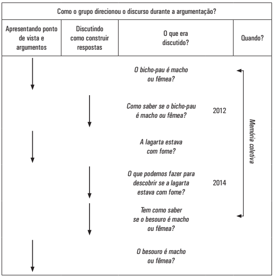 A argumentação, nesse caso, foi gerada pela discordância sobre como fazer a identificação do sexo de um besouro. Para problematizar a sugestão de “olhar por baixo”, a professora relembrou o grupo de outro momento, o estudo do bicho-pau. Essa lembrança conectou a discussão que o grupo vivia no presente - sobre o sexo do besouro - e uma discussão vivida há cerca de um ano e meio - sobre o sexo do bicho-pau (ver Figura 1).