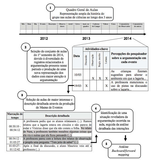 Além disso, é importante retomar que o enfoque em um ou poucos eventos não significa um recorte descontextualizado na história de um grupo. Uma vez selecionada a situação de interesse, em nosso caso, a discussão sobre a fome da lagarta, foi possível, então, fazer um movimento de retorno à história ampla da turma para percorrer outros episódios e estabelecer conexões significativas (backward/forward mapping) - análise 5 daFigura 4.