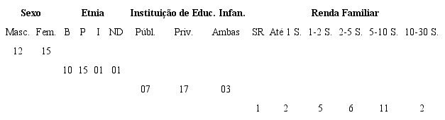 Uma forma de dar visibilidade a diferentes contextos é questionar, por exemplo, quem são os participantes da pesquisa e estabelecer contrastes com contextos mais amplos (GUMPERZ, 1982; HYMES, 1974). No caso da interação que apresentamos, seria questionar sobre quem são as crianças dessa turma e quem são os participantes que protagonizam a situação de análise. Estas crianças passaram por diferentes instituições de Educação Infantil antes de ingressar no 1° ano. O ingresso ocorreu mediante sorteio, o que se reflete na diversidade encontrada no grupo. Diversidade aqui é considerada a partir das diferentes experiências escolares e a heterogênea caracterização étnica e socioeconômica da turma, conforme a tabela 14.